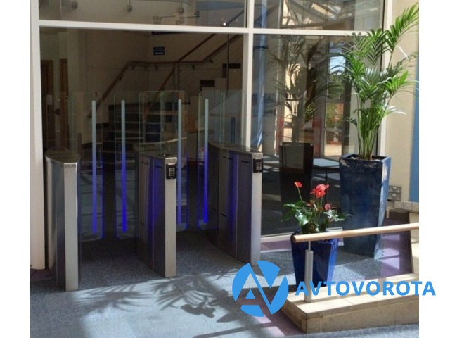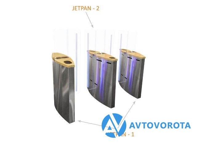 Турникет cо стеклянными прозрачными лопастями (двухсторонняя стойка турникета JETPAN), в комплекте трехцветная система подсветки (синий, зеленый, красный)