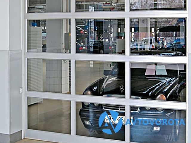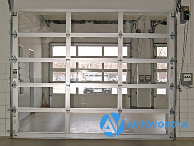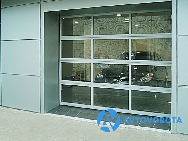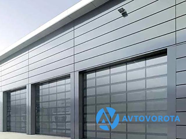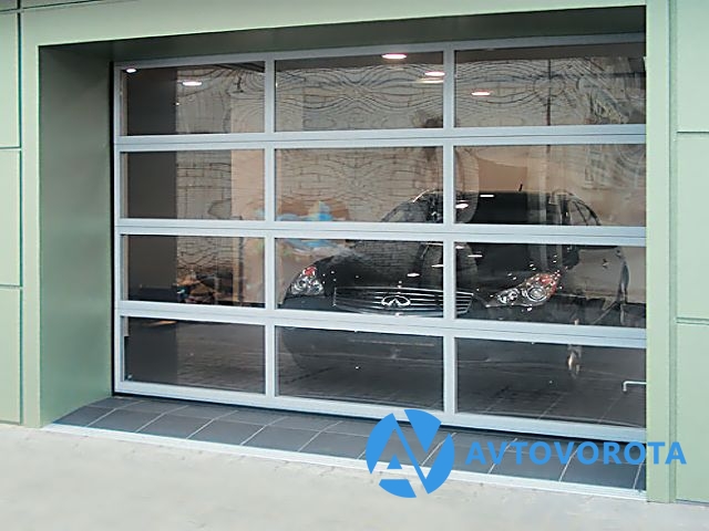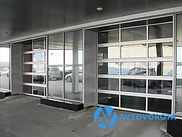 Панорамные секционные ворота (экструдированные алюминиевые профили) с торсионным механизмом подъема. Полностью из панорамных панелей с остеклением 14 мм. 10 видов подъема, ширина до 5 метров, высота до 5,5 метров.