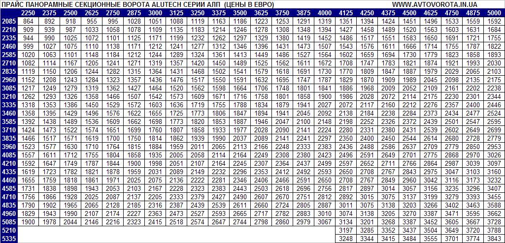 ПРАЙС ПАНОРАМНЫЕ СЕКЦИОННЫЕ ВОРОТА ALUTECH СЕРИИ АЛП.