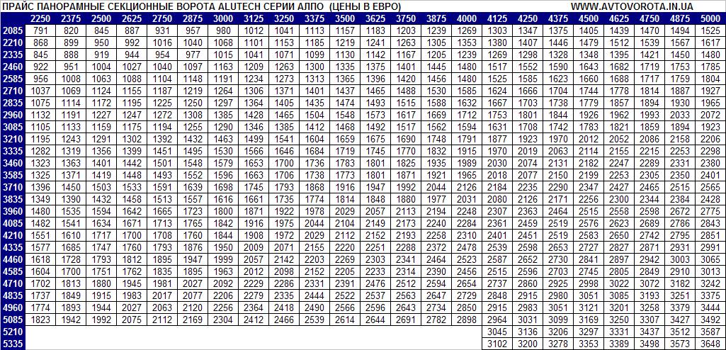 ПРАЙС ПАНОРАМНЫЕ СЕКЦИОННЫЕ ВОРОТА ALUTECH СЕРИИ АЛПО.