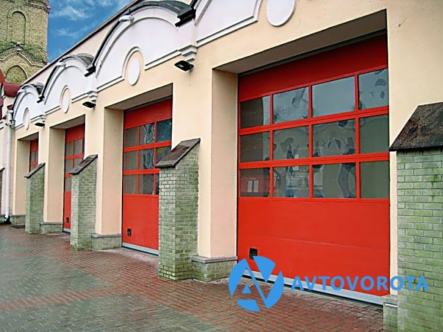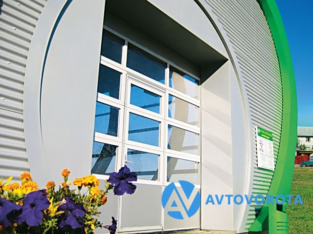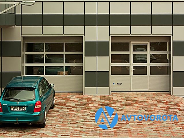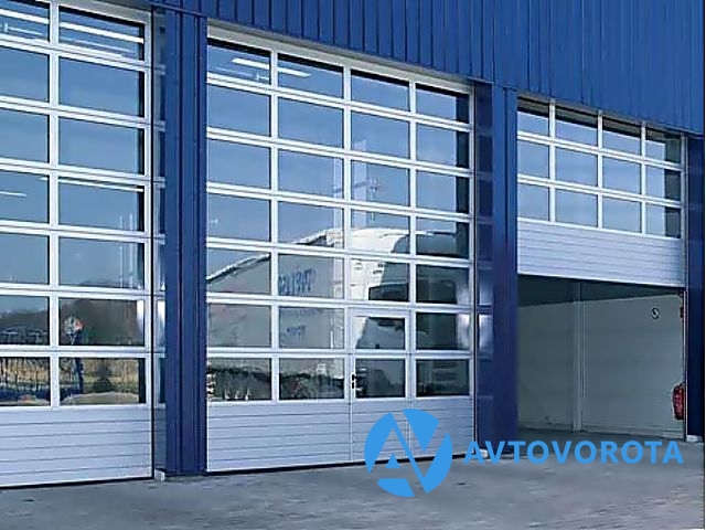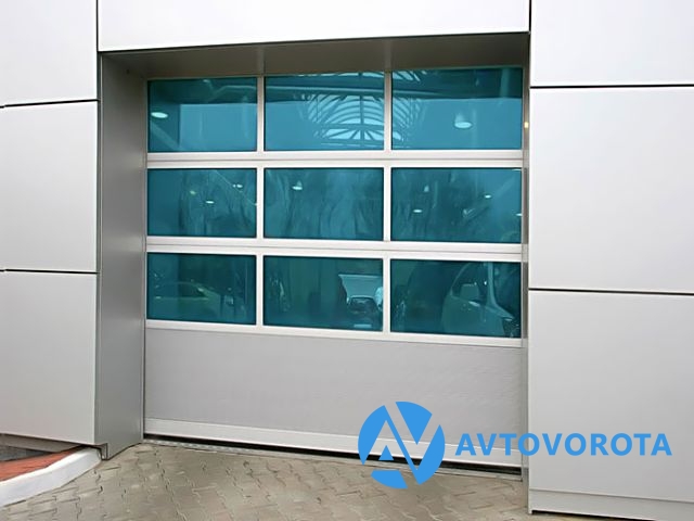 Панорамные секционные ворота (экструдированные алюминиевые профили) с торсионным механизмом подъема. Сочетание панорамных панелей с остеклением 14 мм и сэндвич-панели внизу полотна. 10 видов подъема, ширина до 5 метров, высота до 5,5 метров.