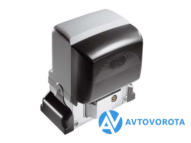 Aвтоматический привод укомплектованный электронной платой с радиодекодером, энкодером с функцией контроля движения и обнаружения препятствий, механическими концевыми выключателями и ведущей шестерней для откатных ворот весом до 800 кг и шириной до 14 м.