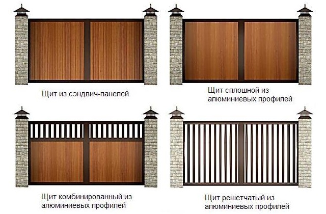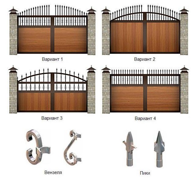 4 варианта исполнения щита ворот в комбинации с декоративными везелями и пиками.